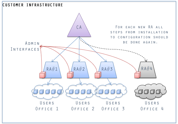 Let’s first go back and clarify what is a registration authority. You can check registration authority term in our documentation section, and briefly it is an intermediate entity to handle user requests for certificates. Usually, in all commercial solutions Registration Authority (further, RA) is a part of a solution together with Certificate Authority. They serve to handle more user related tasks like user management (user data mostly, names, departments and etc.), request management (generating, declining, approving requests for X.509 certificates) and certificate management (like approving, revoking, postponing certificates and etc). In such case Certificate Authority can do the only thing it is supposed to do – issue/revoke certificates, leaving all management functions to Registration Authorities.